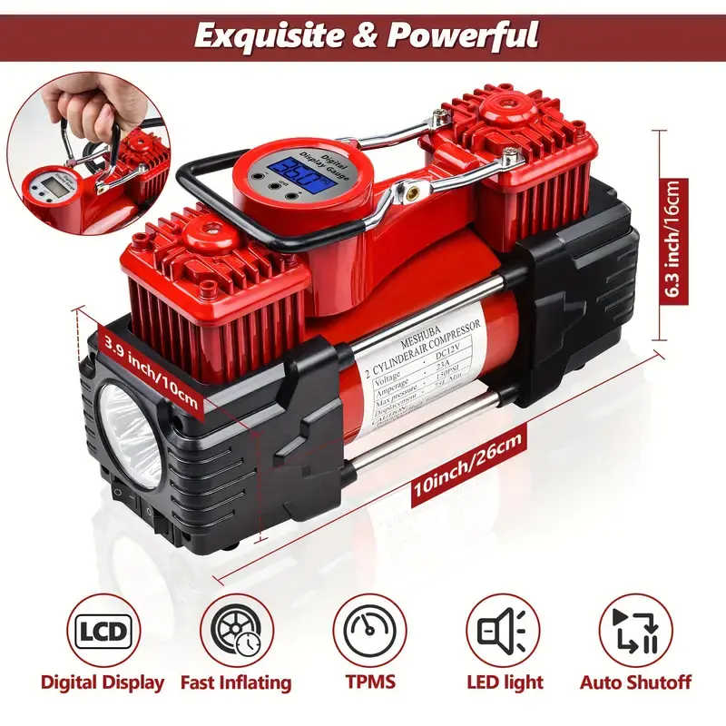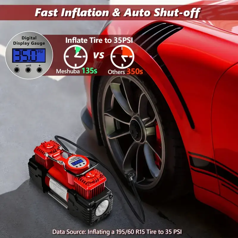 Digital Tire Inflator with LED Light, Auto Shut-Off and Large Capacity for Vehicle, Bicycle, and Other Inflatables