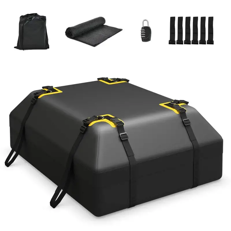 Universal fit car bag to fit for various car roof . Can be folded up for easy storage with the drawstring storage bag. Covered with hook and loop fastener to further improve the water resistance ability. Thoughtful accessories such as waterproof double zippers with lock holes and 4 digit luggage combination lock are included for added security. Made from durable 3-Layer 100% triple waterproof sealing PVC material for long service life. Easy installation steps for time and energy saving. 15 cu.ft large capacity to hold 2 double tents, 4 sleeping bags, 4 medium suitcases. Features rain curtain with hook and loop fasteners for additional water resistance.. Bonus anti-slip mat to prevent scratches and better grip of car roof. High-strength adjustable straps with robust buckles for firm fit.