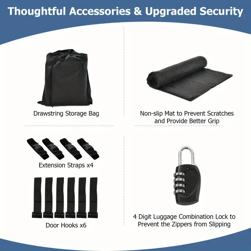 Color: Black+Yellow. Material: PVC, Fabric . Item weight: 9 lbs. Overall Dimension: 34" x 44" x 17" (L x W x H) . Storage Bag Dimension: 36" x 23.5" (L x W) . Non-slip Mat Dimension: 35.5" x 47" (L x W) . Storage capacity: 15 cubic feet.