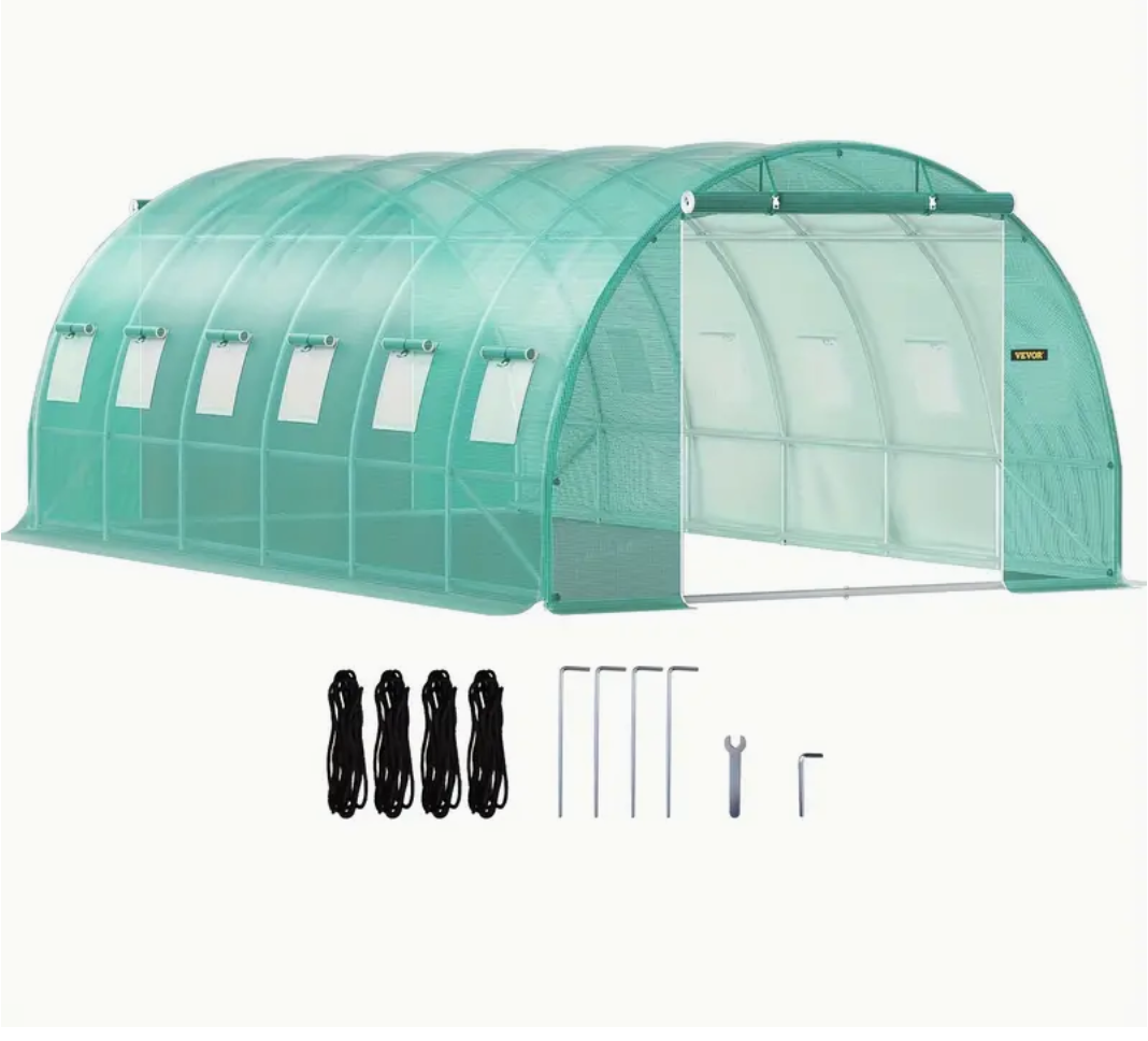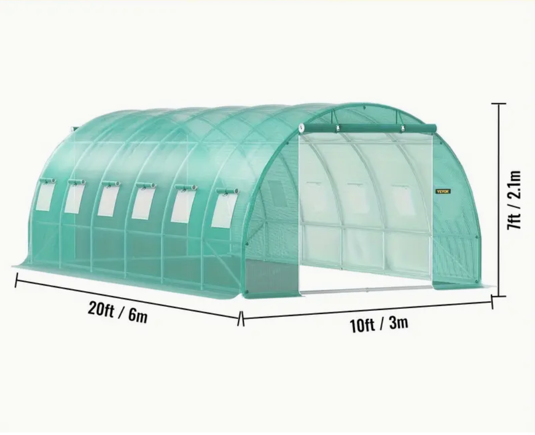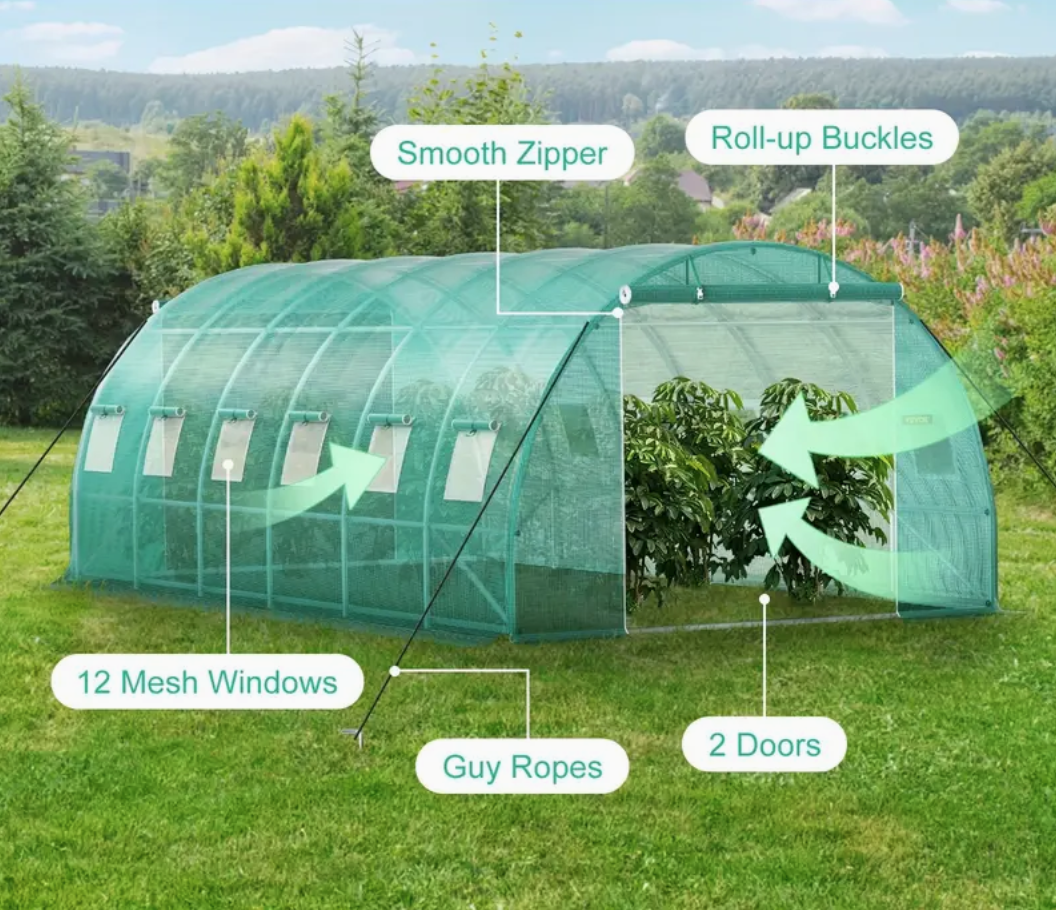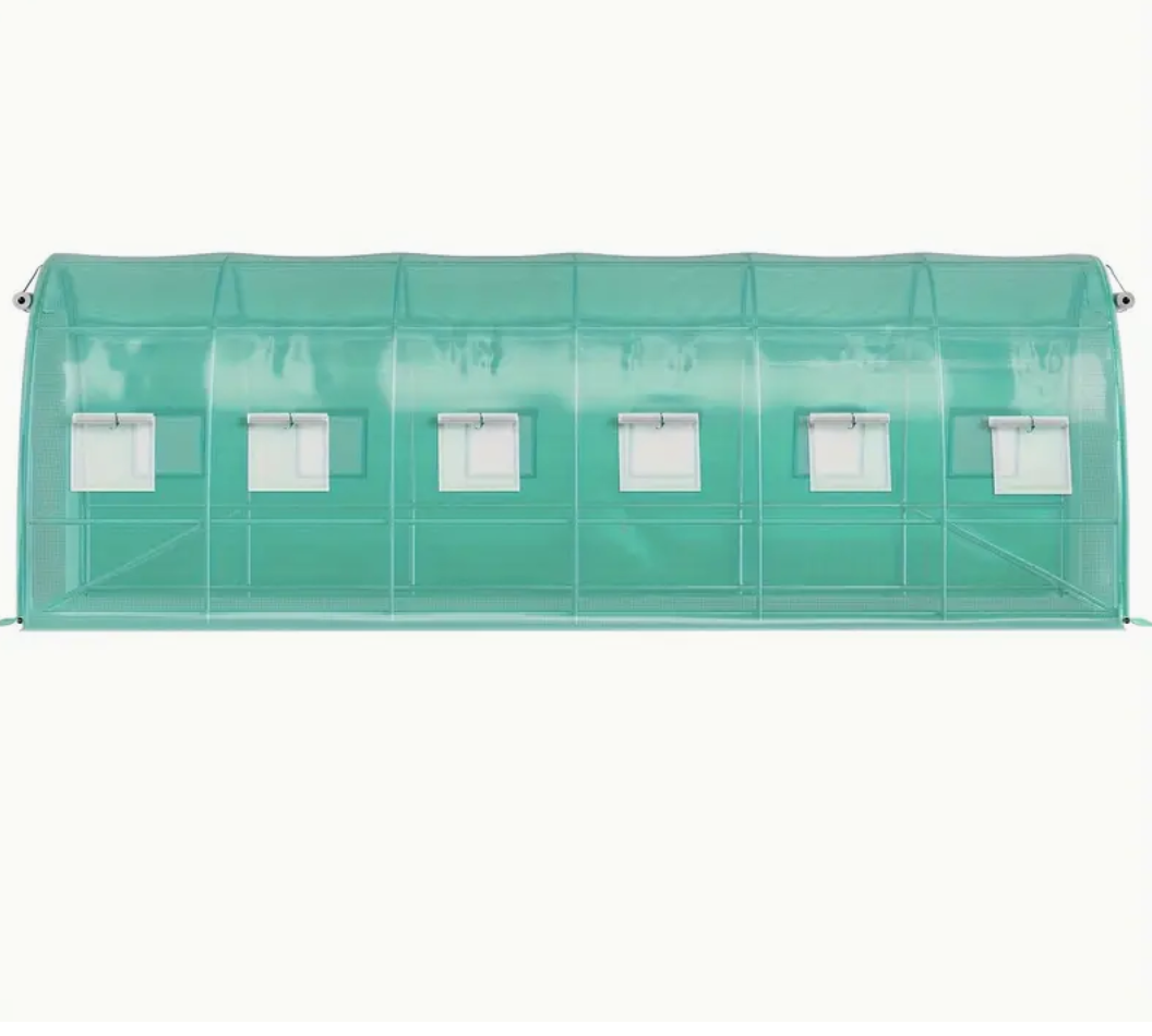 20 x 10 x 7 ft Portable Walk-in Tunnel Greenhouse - Other Plant Growing Accessories with Galvanized Steel Hoops, 3 Top Beams, Diagonal Poles, 2 Zippered Doors, 12 Roll-up Windows, and Durable Green Cover for Outdoor Gardening