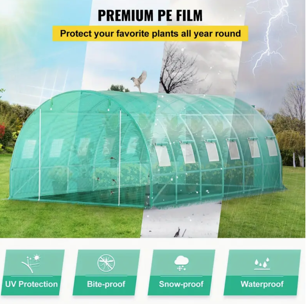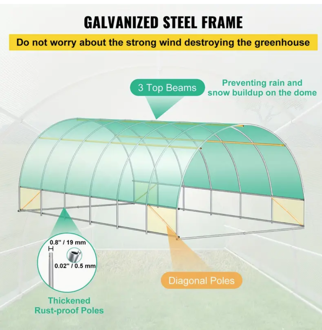 20x10x7 Ft Large Walk-in Tunnel Greenhouse - Portable Plant Hot House with Galvanized Steel Hoops, 3 Top Beams, Diagonal Poles, 2 Zippered Doors, 12 Roll-up Windows, and Durable Green Cover - Perfect for Gardening and Planting