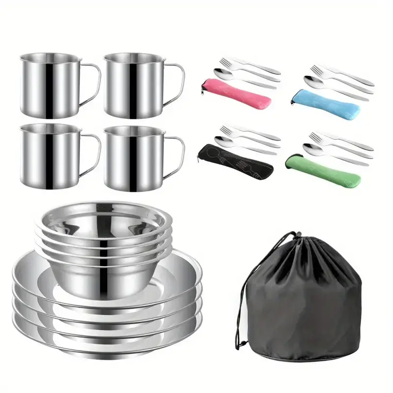 This camping mess kit includes 29pcs essentials. 4 x 6.3'' bowls, 4 x 8'' dinner plates, 4 x 10oz mugs, 4 x dinner cutlery set (4 x forks, 4 x spoons, 4 x knives) with cases, 1 x food grade mesh bag.