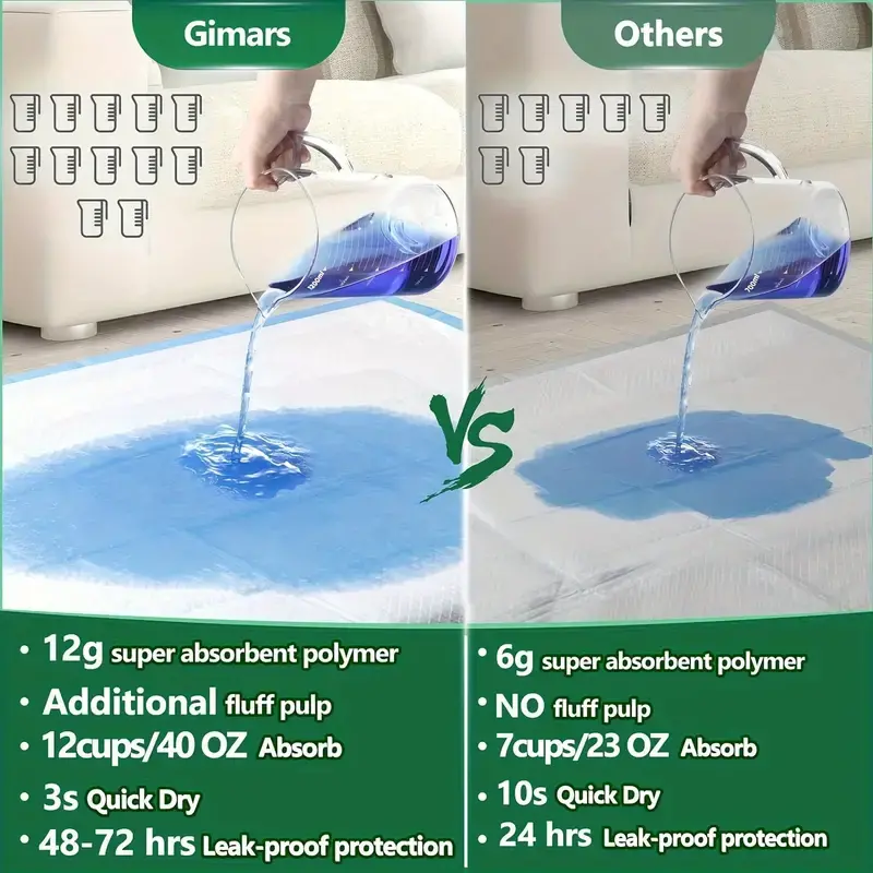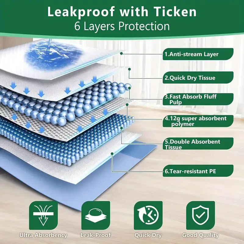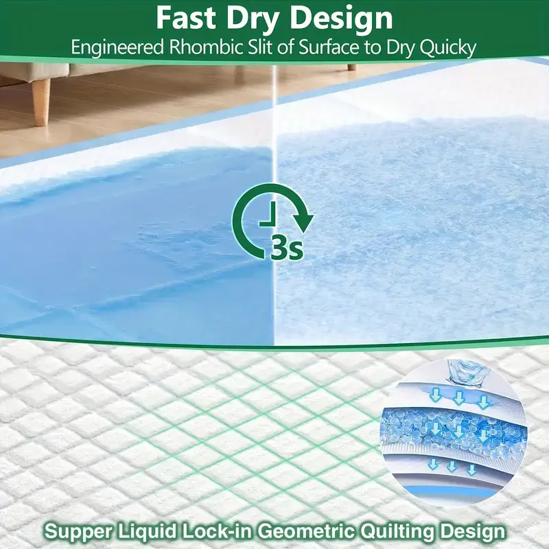 Thicken Durable Waterproof PE membrane Prevent Liquid Leaking To Floor More Efficiently – This Wee Wee Pads For Dogs Are Good To Protect Carpet And Floor From Liquid Damage In Your Absence And Handy For Cold Wet Weather. With This Thicker PEmembrane Film, These Dog Training Pads Are Easy To Pick Up Without Leakage Or Overflow.