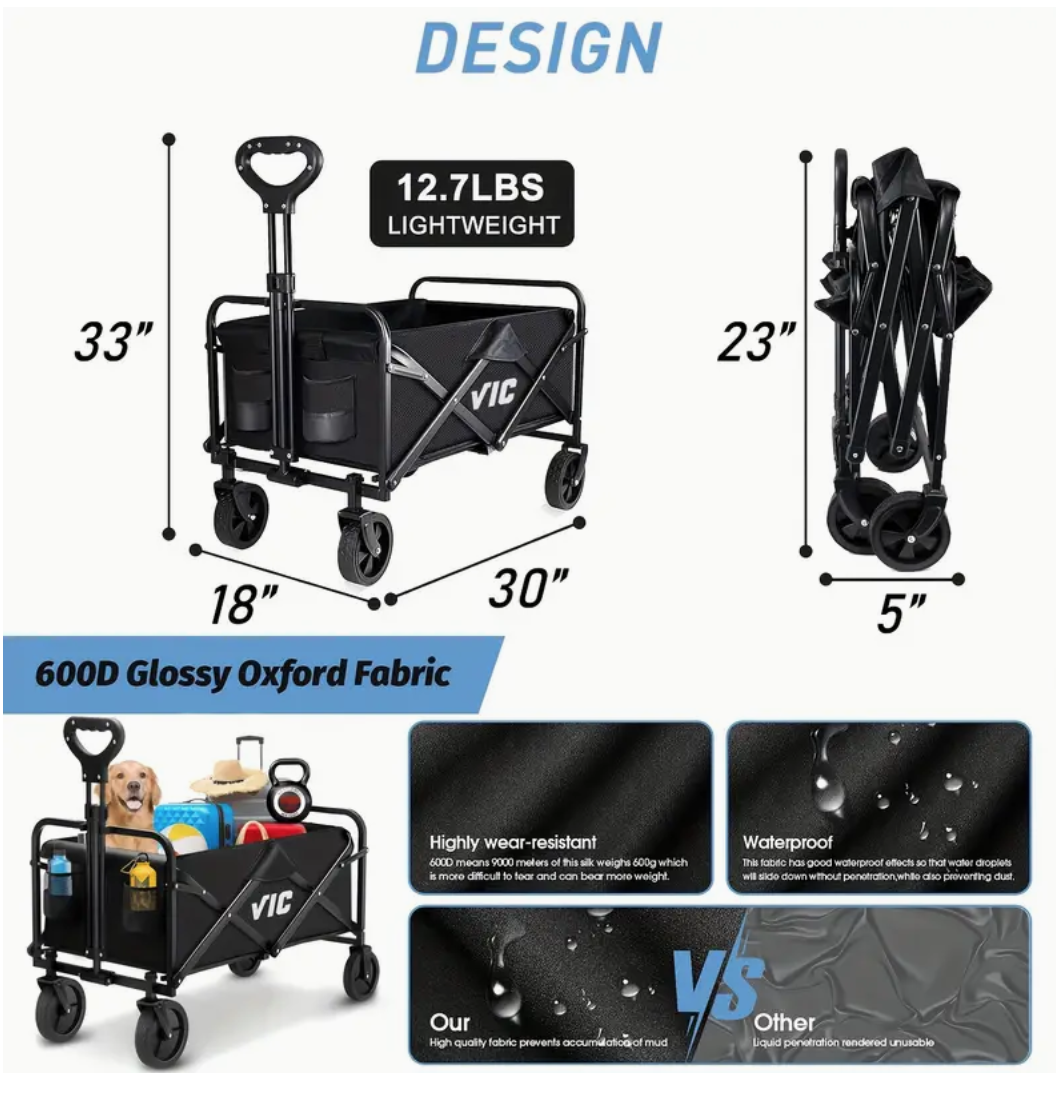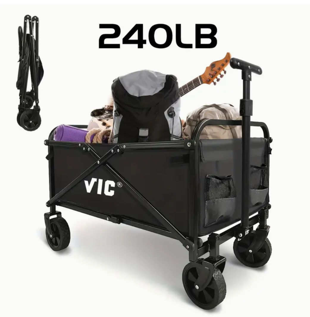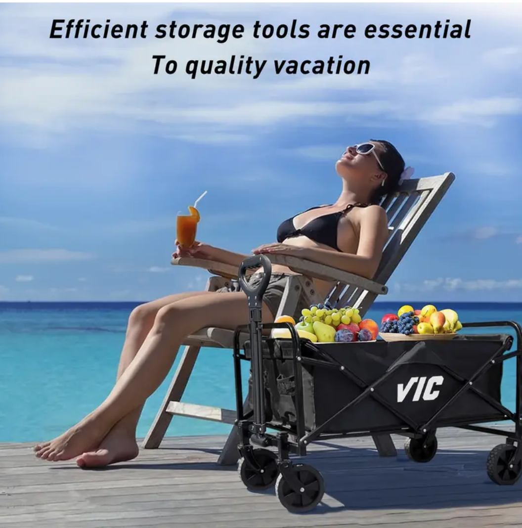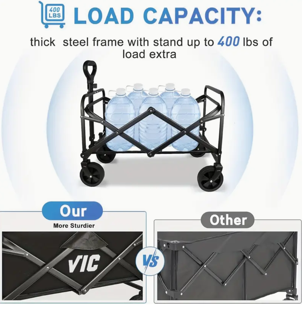 Collapsible Folding Wagon, Beach Wagon Cart Heavy Duty 400LBs Foldable, Utility Grocery Wagon With Side Pocket For Camping Garden Sports, L4